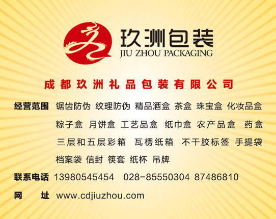 成都玖洲禮品包裝有限公司成立于2007年,辦公面積100余平米,工廠面積1000余平米,擁有專業的高素質的設計、排版、印刷專業技術人員20余人,目前主要項目為各種防偽標識、標簽、宣傳畫冊、DM單、精裝書、手提袋、不干膠、賀卡、包裝盒、禮品盒、紙袋、臺歷、掛歷等,為客戶設計、生產各種外觀精美、質量******、價位合理的印刷品,提供從印前到印后專業的全方位解決方案廣泛應用于服飾、皮具、化妝品、美容儀器、保健品、珠寶首飾、茶葉、電子產品、五金配件及其它日用制品等行業。